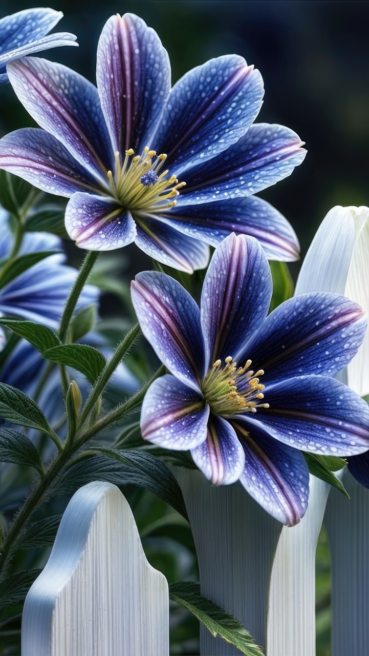 Edytor tapety: Niebieskie kwiaty i białe sztachety płotu