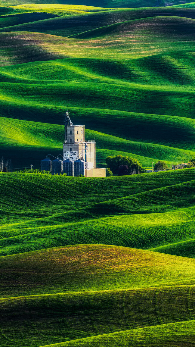 Edytor tapety: Budowla na zielonych wzgórzach w Palouse