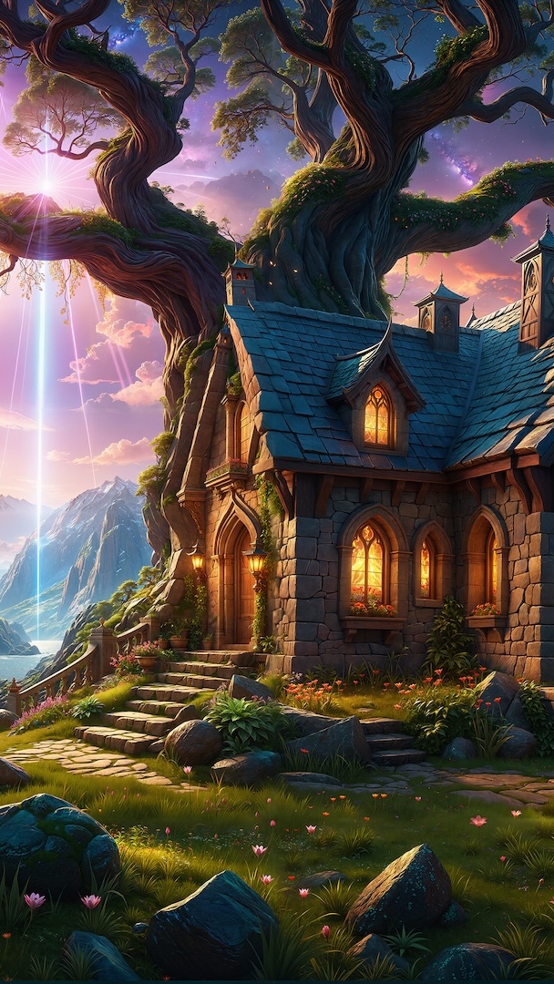 Edytor tapety: Oświetlony dom pod rozłożystym drzewem