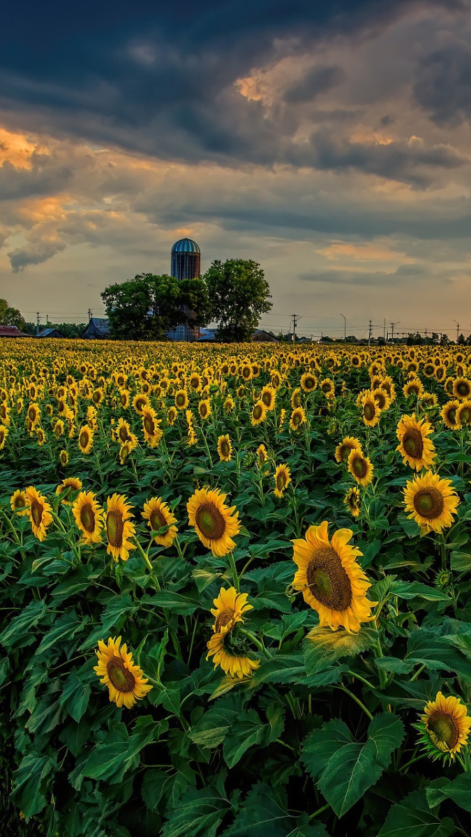 Edytor tapety: Chmurne niebo nad słonecznikowym polem