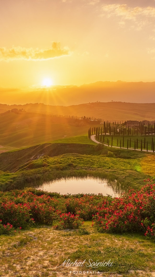 Edytor tapety: Promienie słońca nad wzgórzami w Toskanii