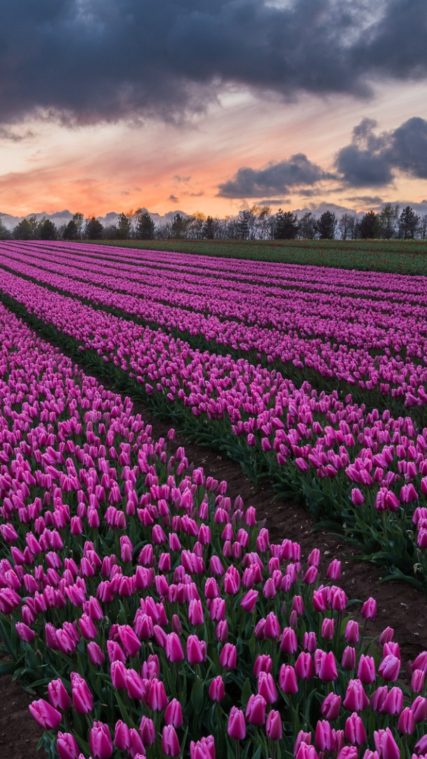 Edytor tapety: Chmury nad plantacją różowych tulipanów