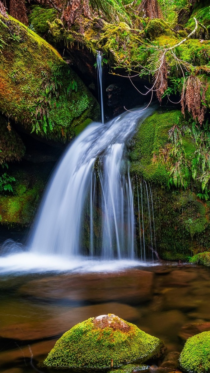 Edytor tapety: Rośliny przy wodospadzie na omszałych skałach