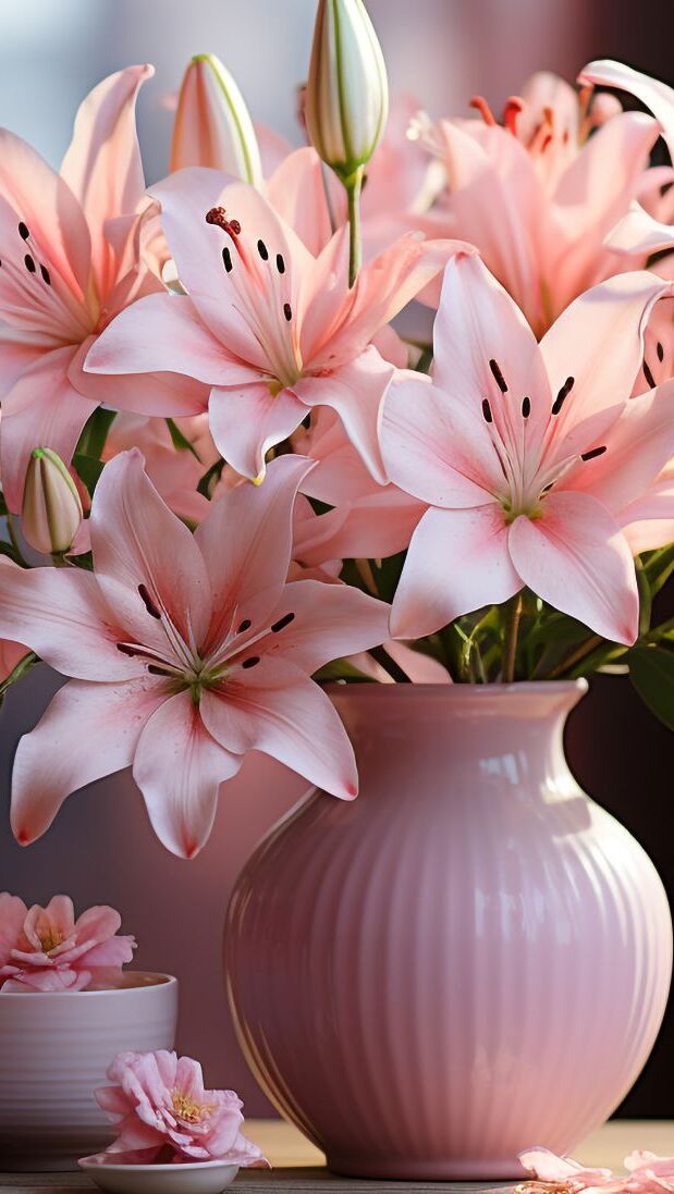 Edytor tapety: Różowe lilie w różowym wazonie