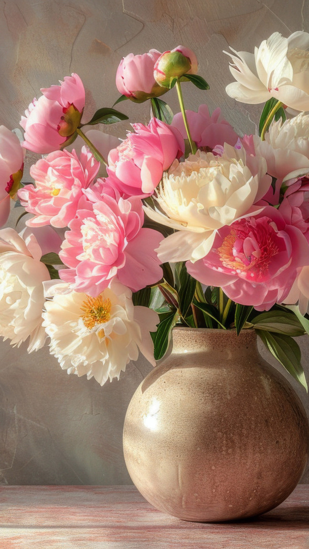 Edytor tapety: Różowe i białe piwonie w wazonie