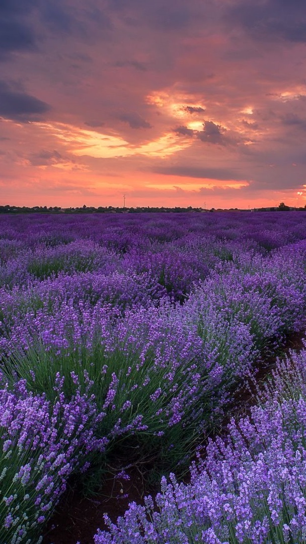Edytor tapety: Chmurne niebo nad polem lawendowym