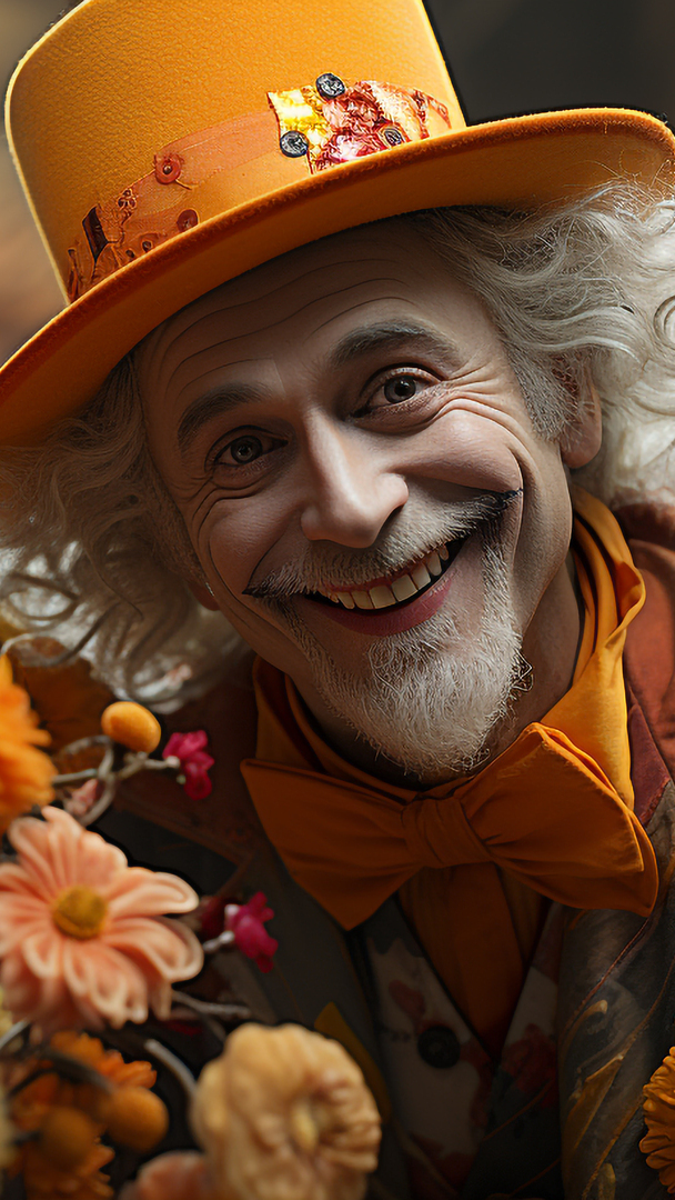 Edytor tapety: Uśmiechnięty siwowłosy mężczyzna w pomarańczowym kapeluszu