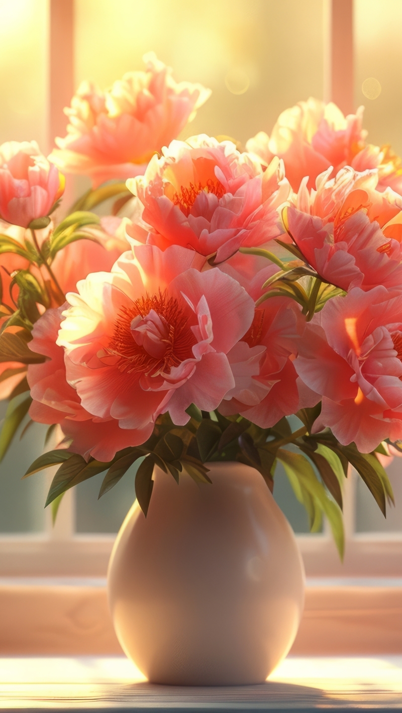 Edytor tapety: Rozświetlone różowe piwonie w wazonie