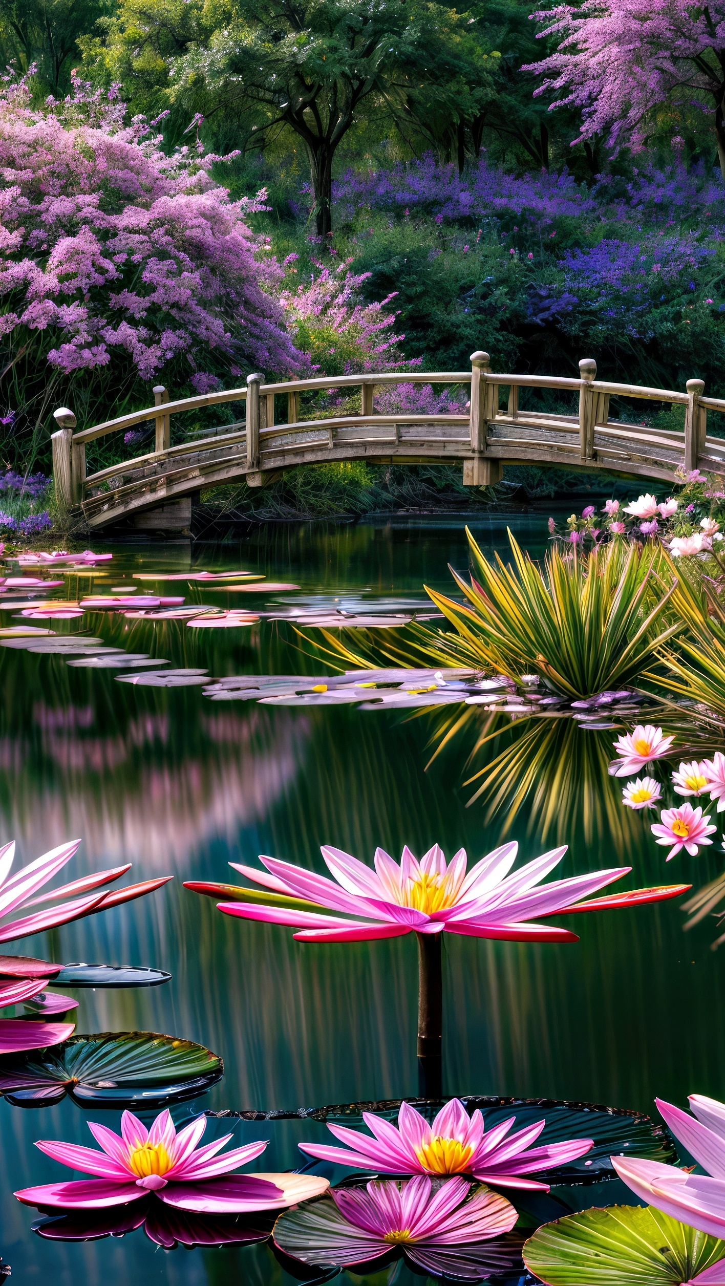 Edytor tapety: Lilie wodne obok mostu na stawie