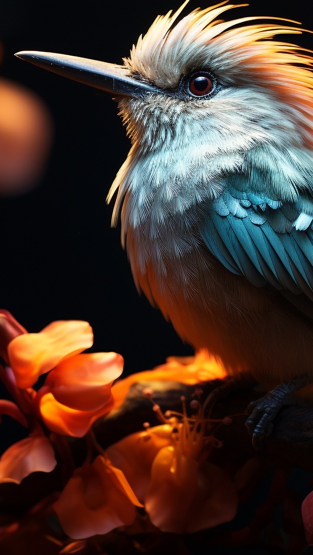 Edytor tapety: Ptak na gałązce z pomarańczowymi kwiatkami