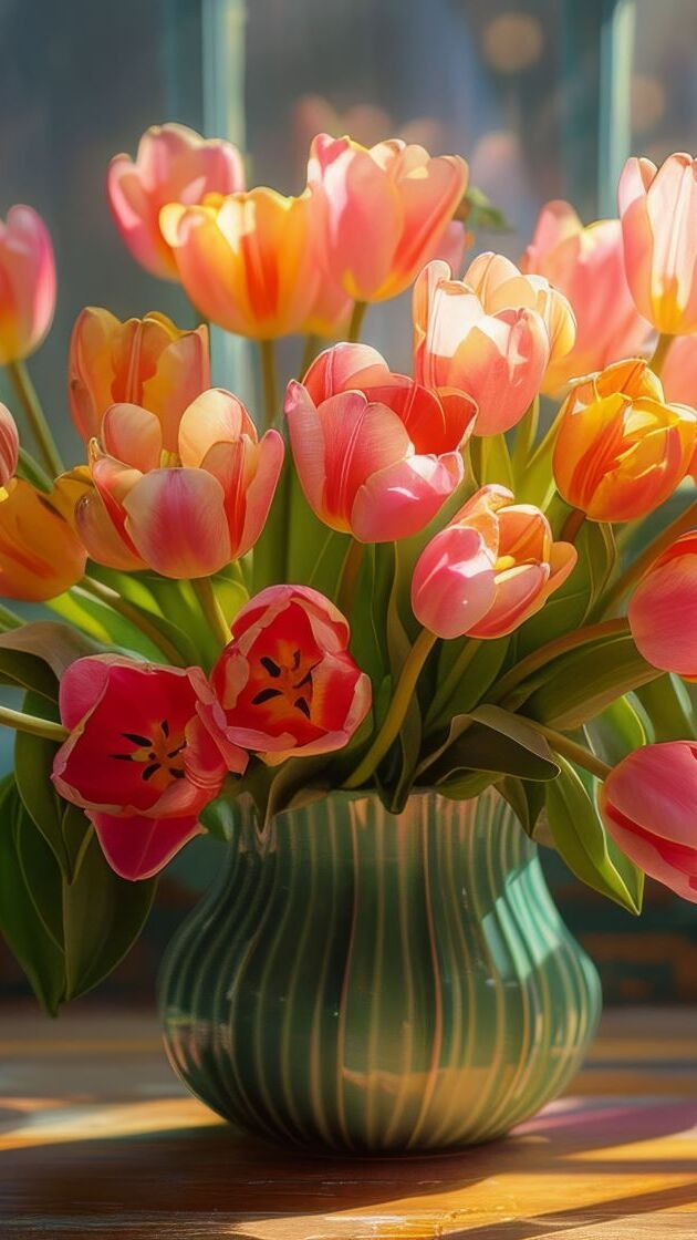 Edytor tapety: Rozświetlony bukiet tulipanów w wazonie