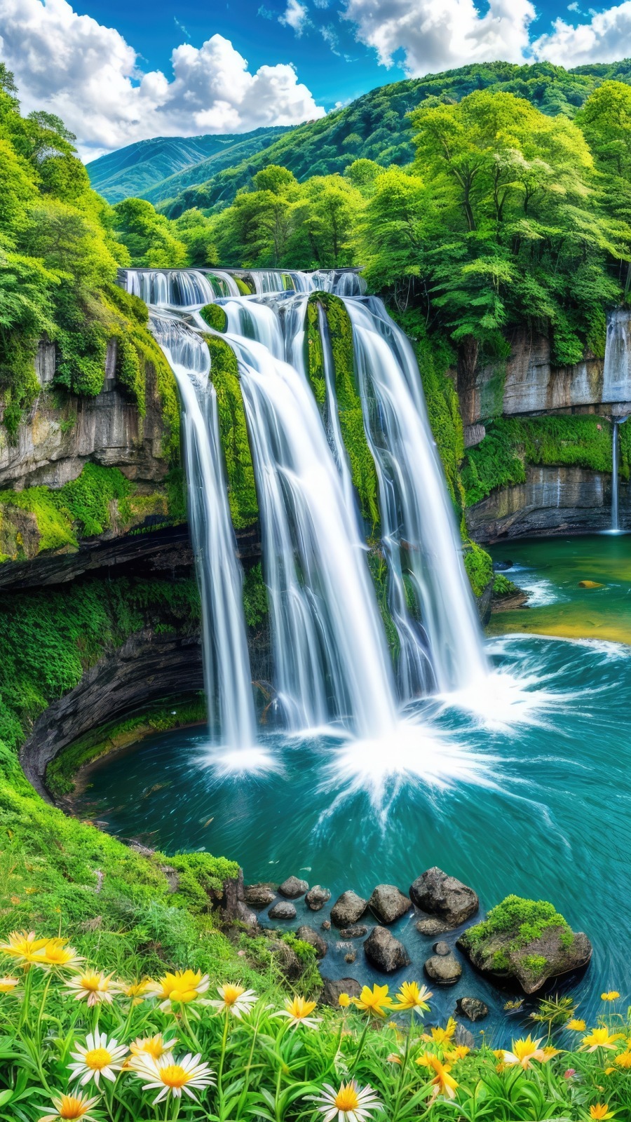 Edytor tapety: Kwiaty i drzewa przy skalnym wodospadzie