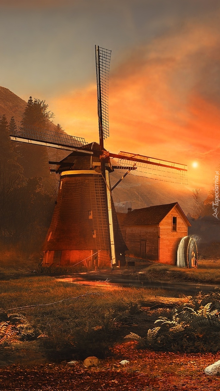 Edytor tapety: Wiatrak w zachodzącym słońcu