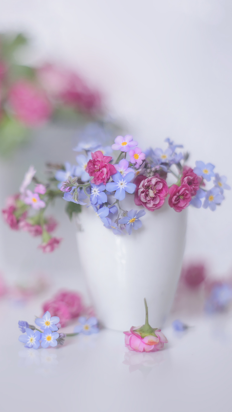 Edytor tapety: Niezapominajki i głóg w białym wazoniku