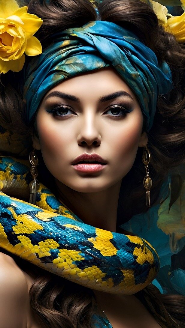 Edytor tapety: Twarz kobiety z kolorowym wężem