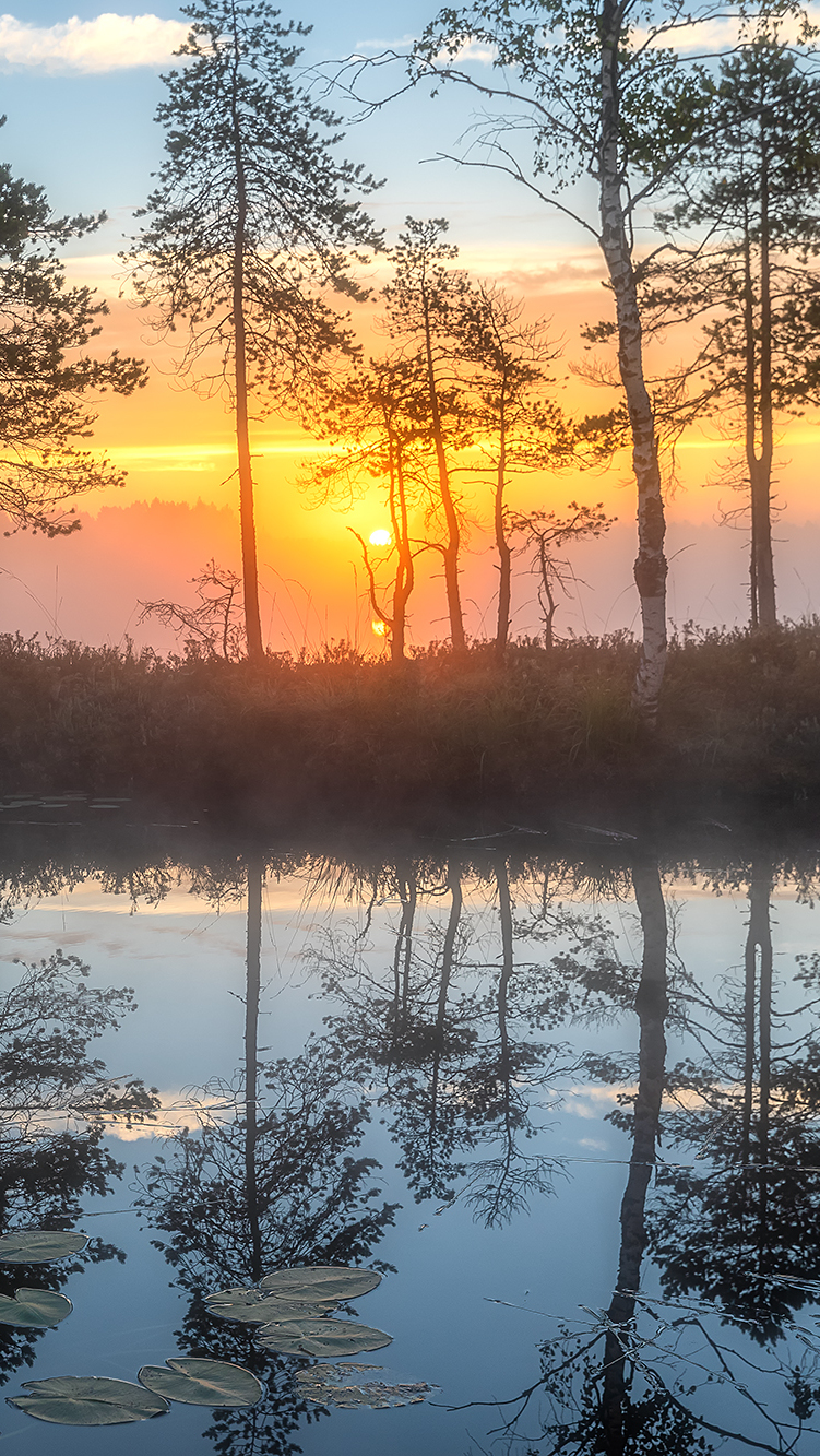 Edytor tapety: Odbicie drzew w jeziorze o poranku