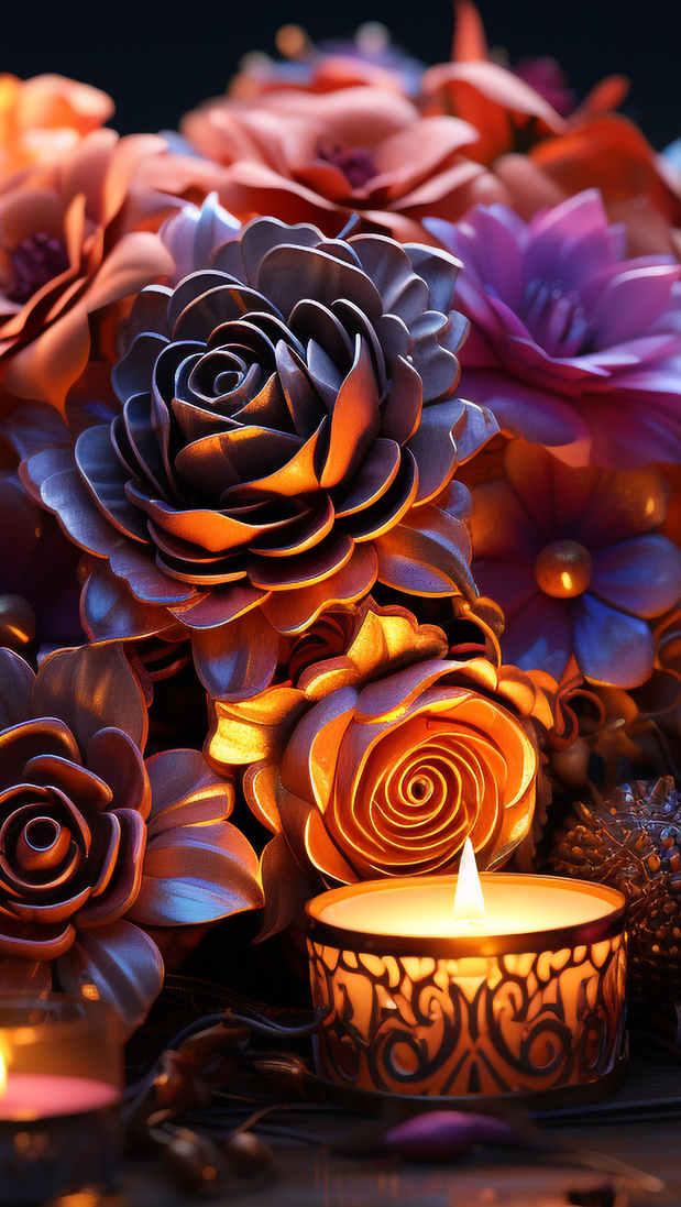 Edytor tapety: Płonąca świeca obok bukietu kwiatów