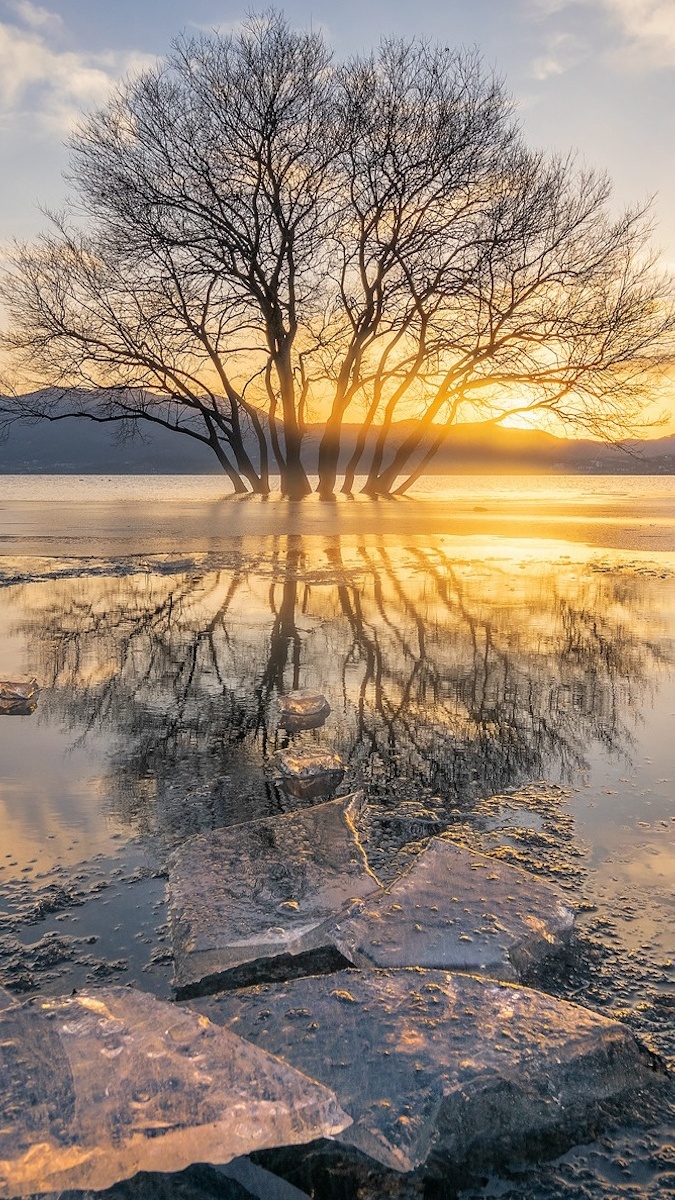 Edytor tapety: Bezlistne drzewa pośrodku jeziora