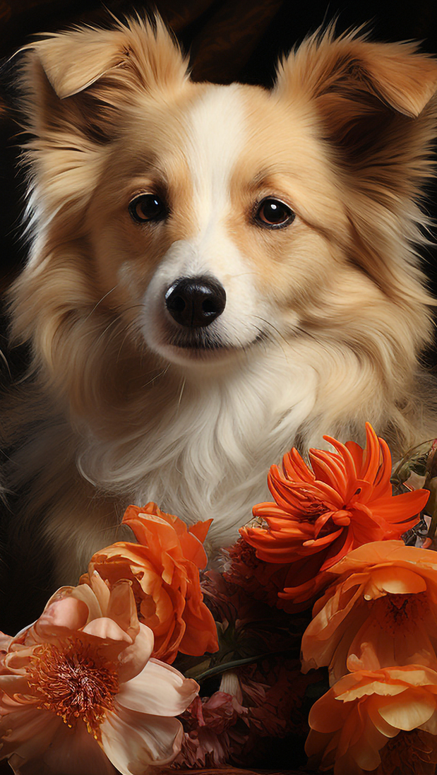 Edytor tapety: Kudłaty pies i kwiaty