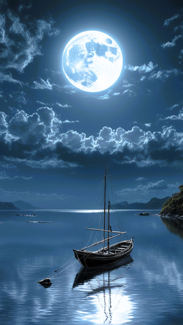 Edytor tapety: Żaglówka na jeziorze w blasku księżyca