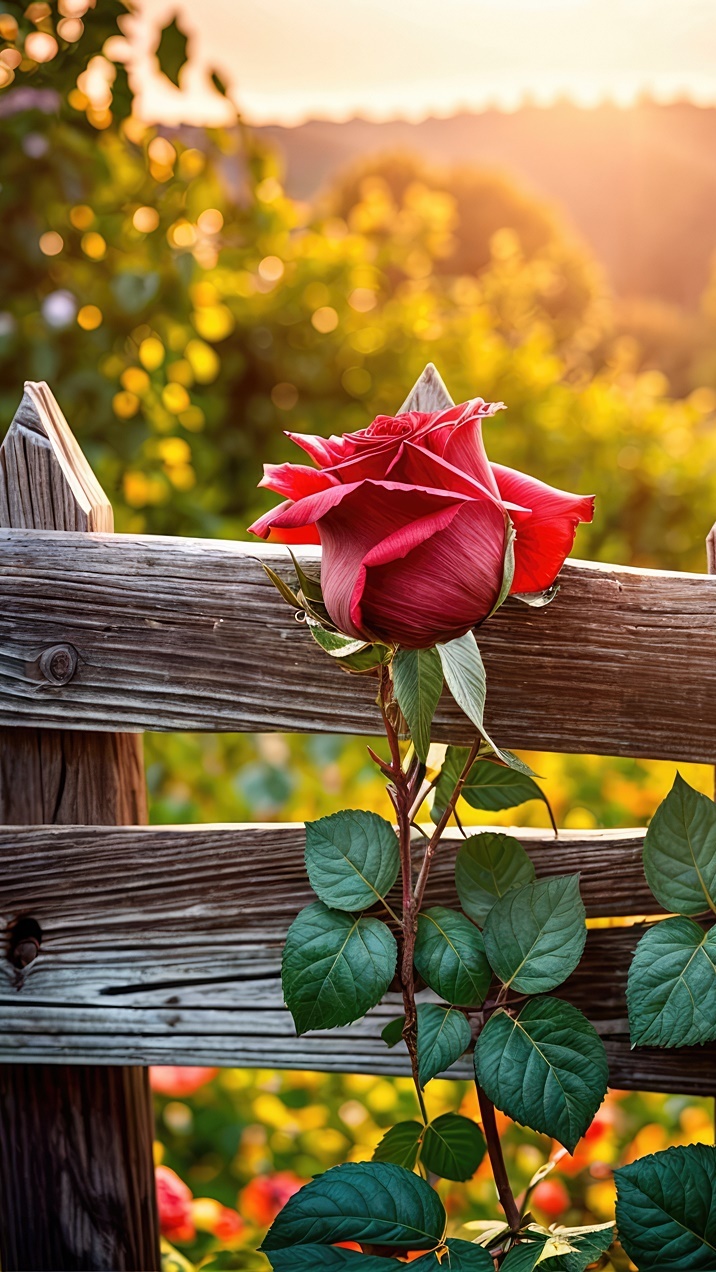 Edytor tapety: Rozświetlona czerwona róża przy płocie