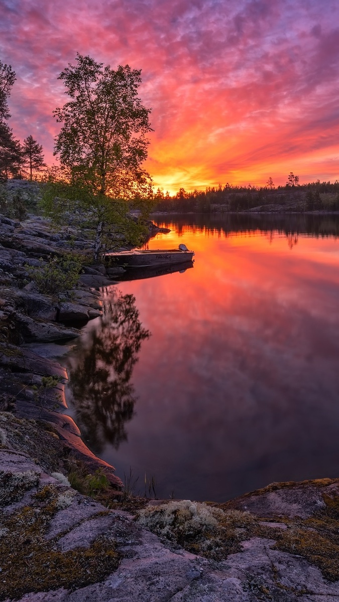 Edytor tapety: Żółto czerwony zachód słońca nad jeziorem