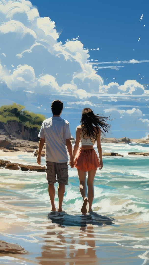 Edytor tapety: Mężczyzna z kobietą spacerują po plaży