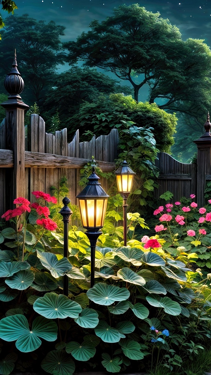 Edytor tapety: Lampy przy płocie w ogrodzie kwiatowym