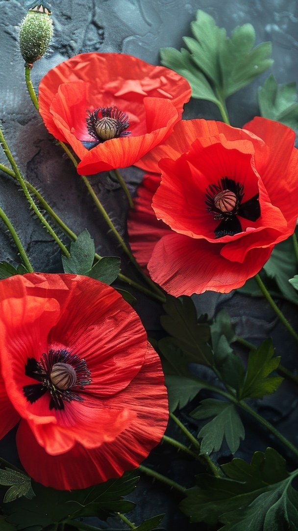 Edytor tapety: Trzy czerwone maki z liśćmi