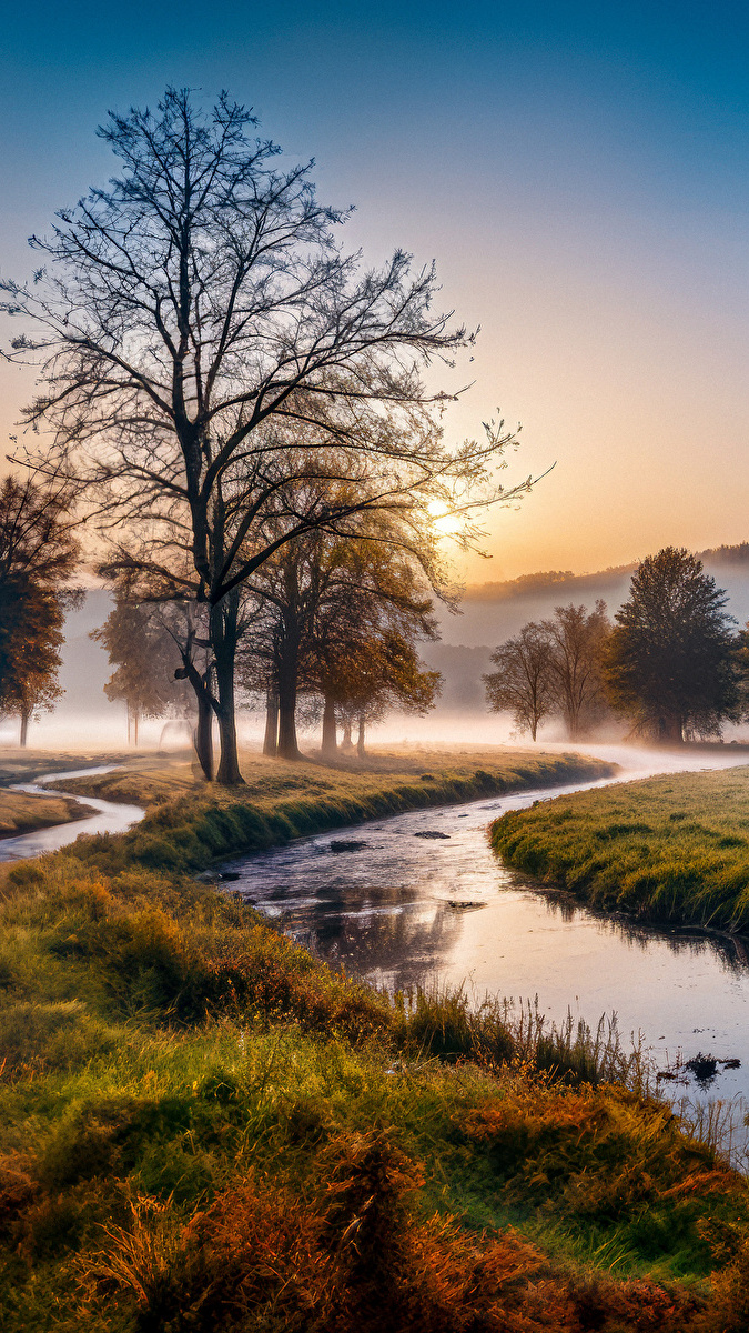Edytor tapety: Poranna mgła nad polami i rzeką