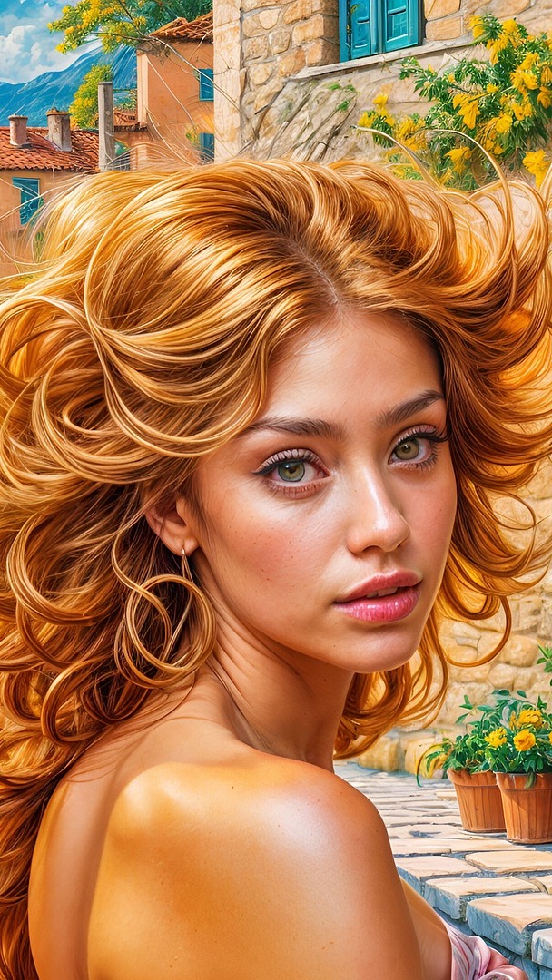 Edytor tapety: Twarz kobiety z rozwianymi kręconymi włosami