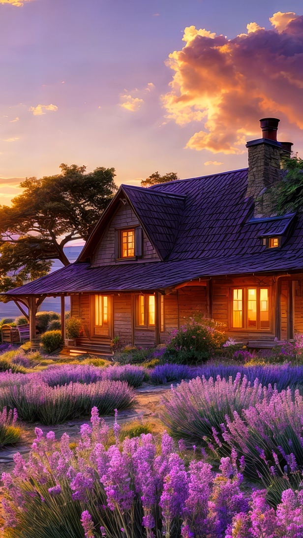 Edytor tapety: Oświetlony dom wśród kwitnącej lawendy