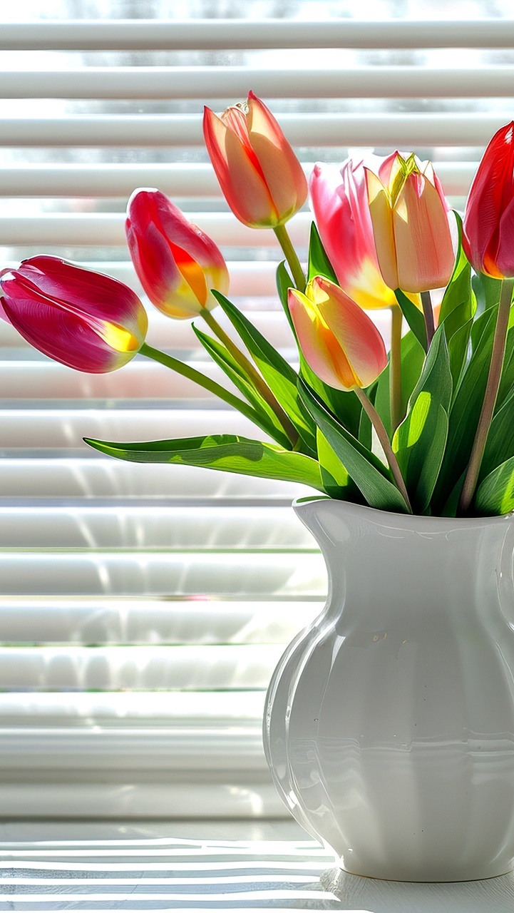 Edytor tapety: Tulipany w dzbanku przy oknie