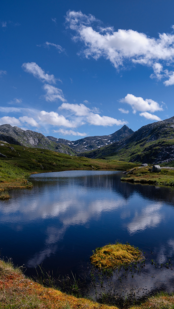 Edytor tapety: Odbicie białych chmur w górskim jeziorze