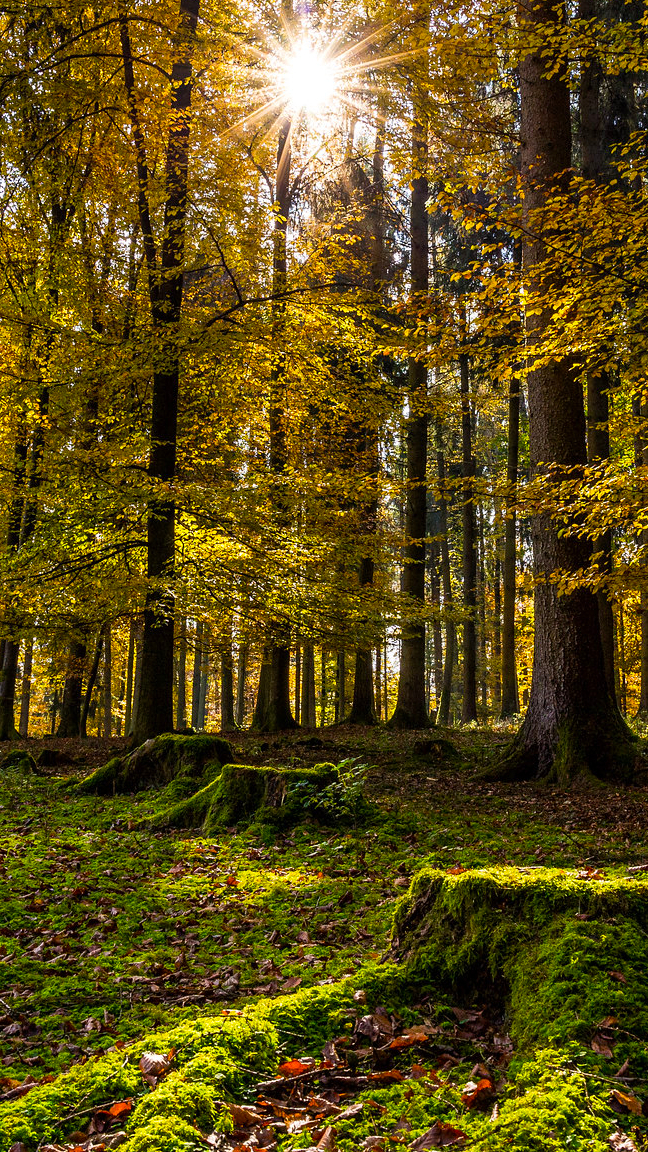 Edytor tapety: Pniaki porośnięte mchem w słonecznym lesie