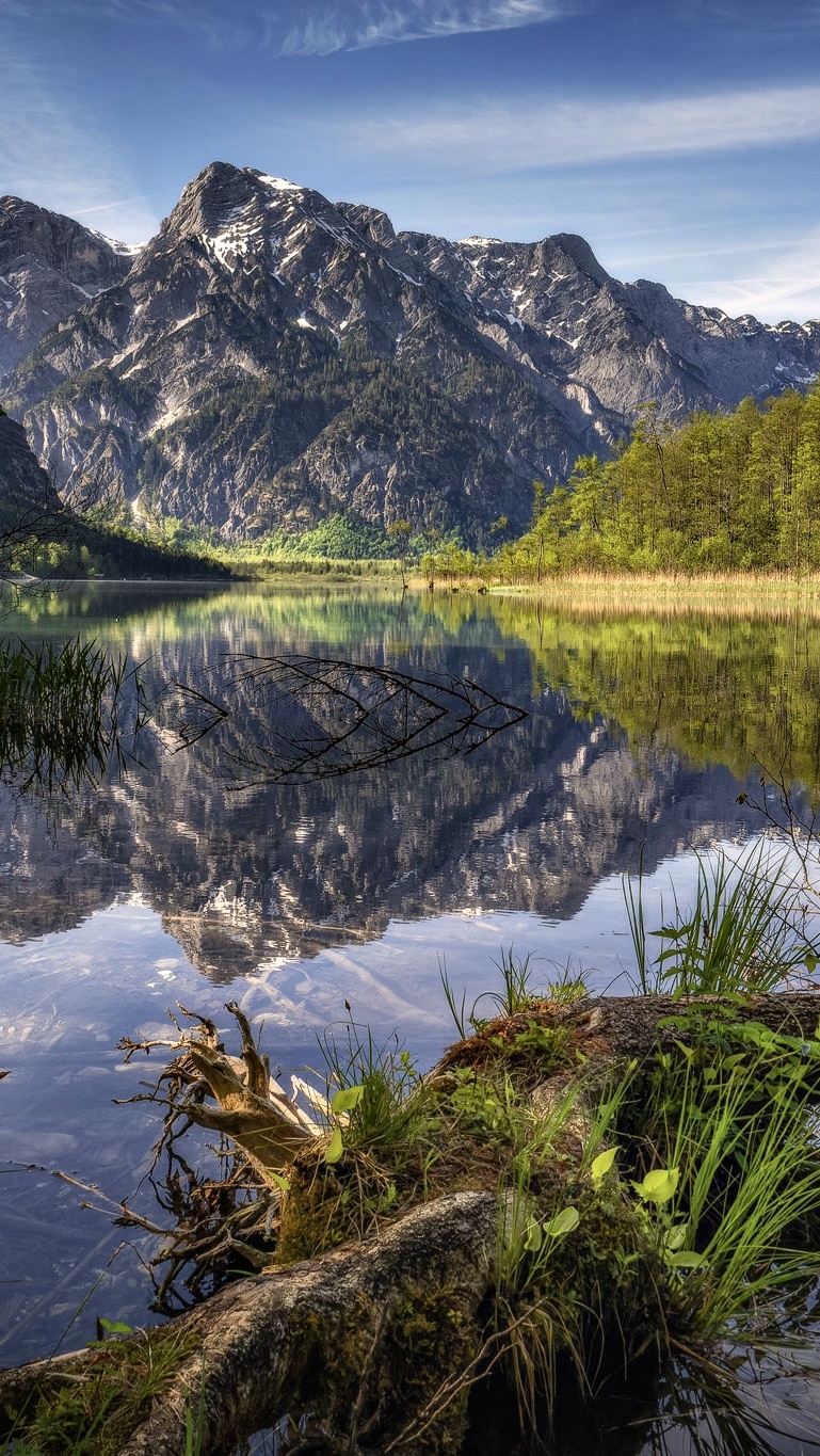 Edytor tapety: Widok znad jeziora Almsee na góry