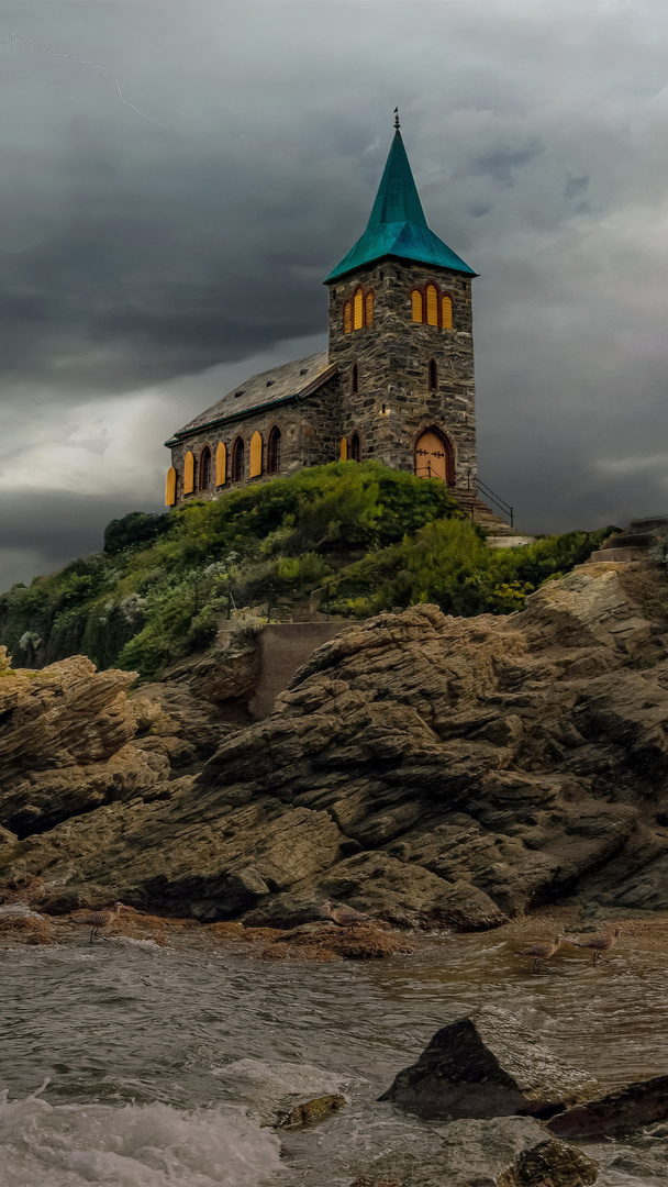 Edytor tapety: Pochmurne niebo nad kościołem na skałach