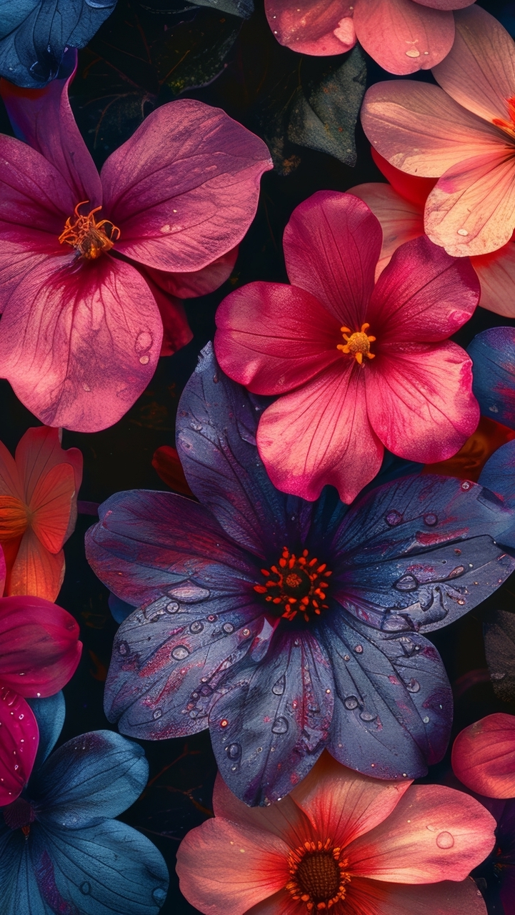 Edytor tapety: Krople wody na kolorowych kwiatach