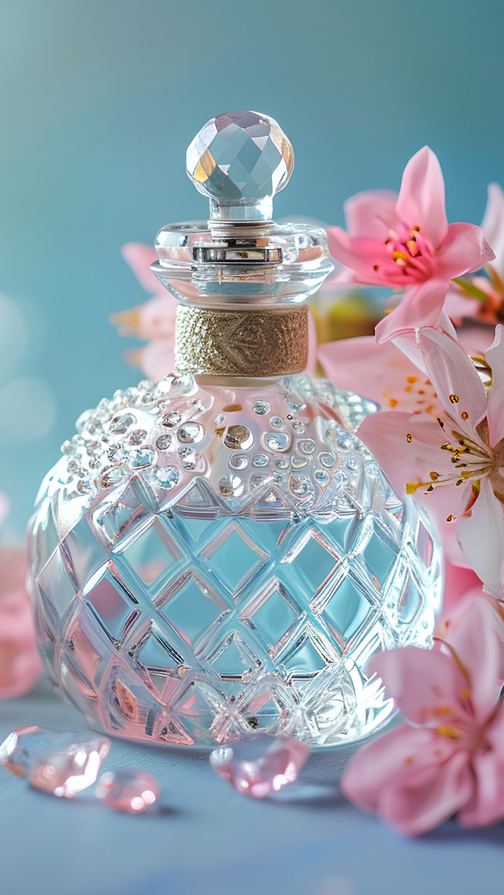 Edytor tapety: Różowe kwiatki obok flakonu z perfumami