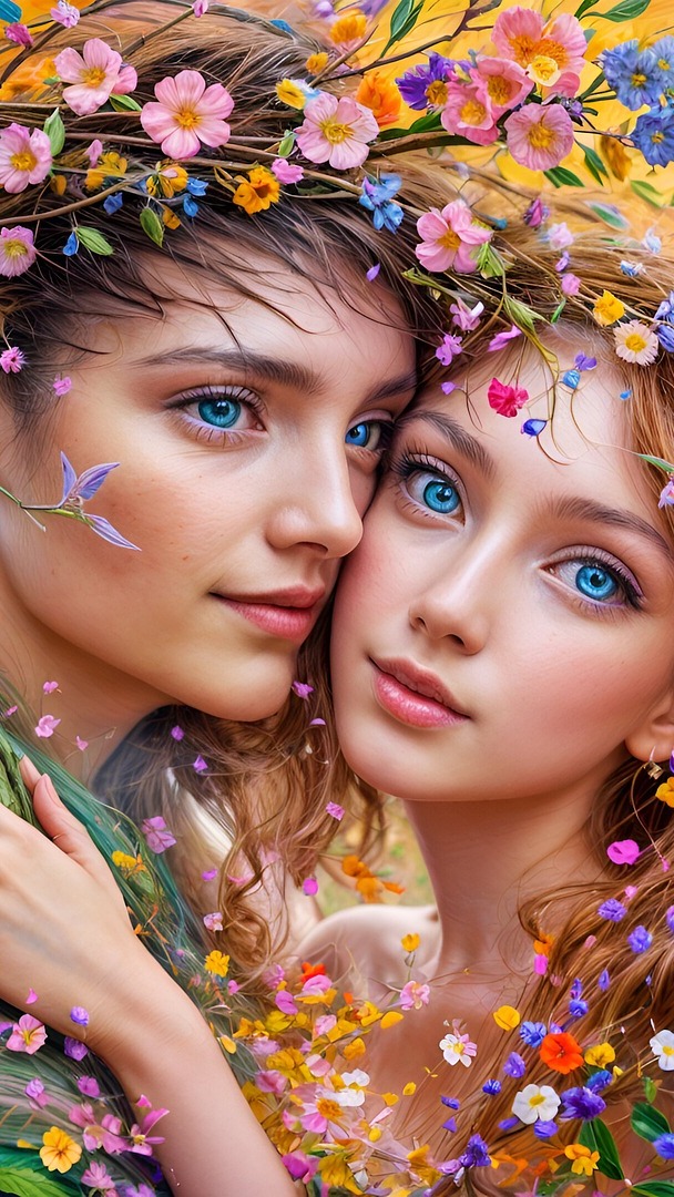 Edytor tapety: Przytulona para na tle ukwieconych gałązek