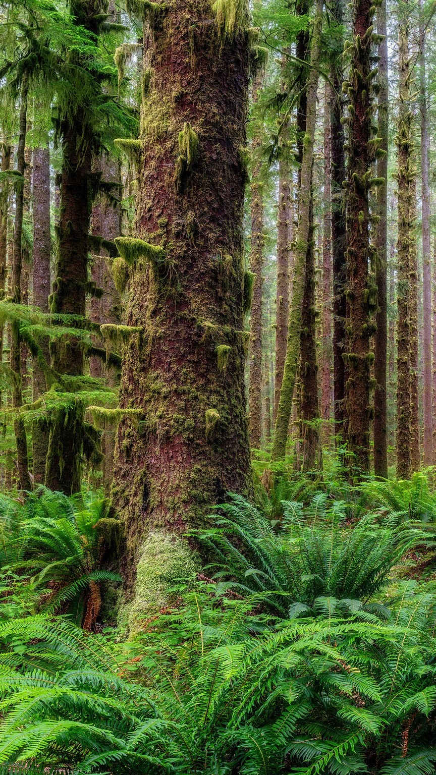 Edytor tapety: Omszałe drzewa wśród paproci w lesie