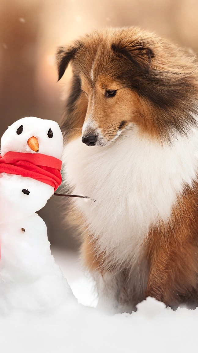 Edytor tapety: Owczarek szetlandzki obok bałwanka