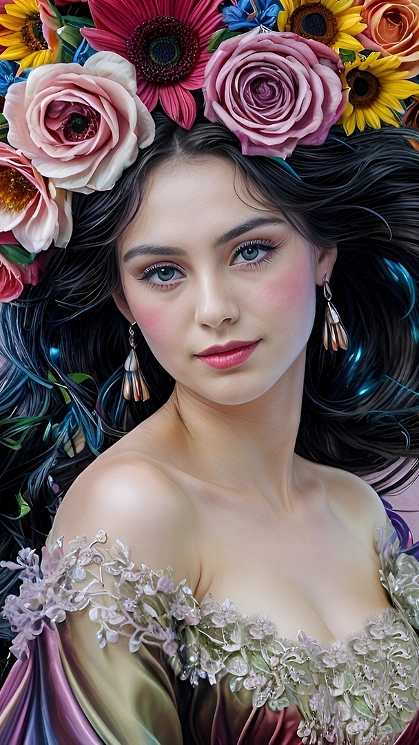 Edytor tapety: Portret brunetki z kwiatami na głowie