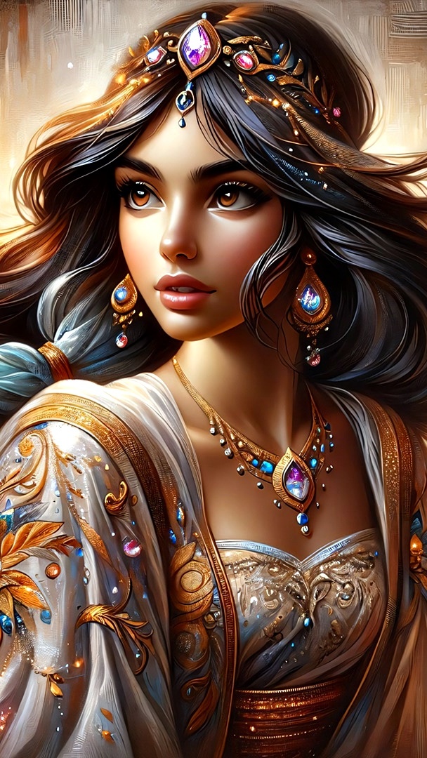 Edytor tapety: Księżniczka z biżuterią w kolorowej sukni