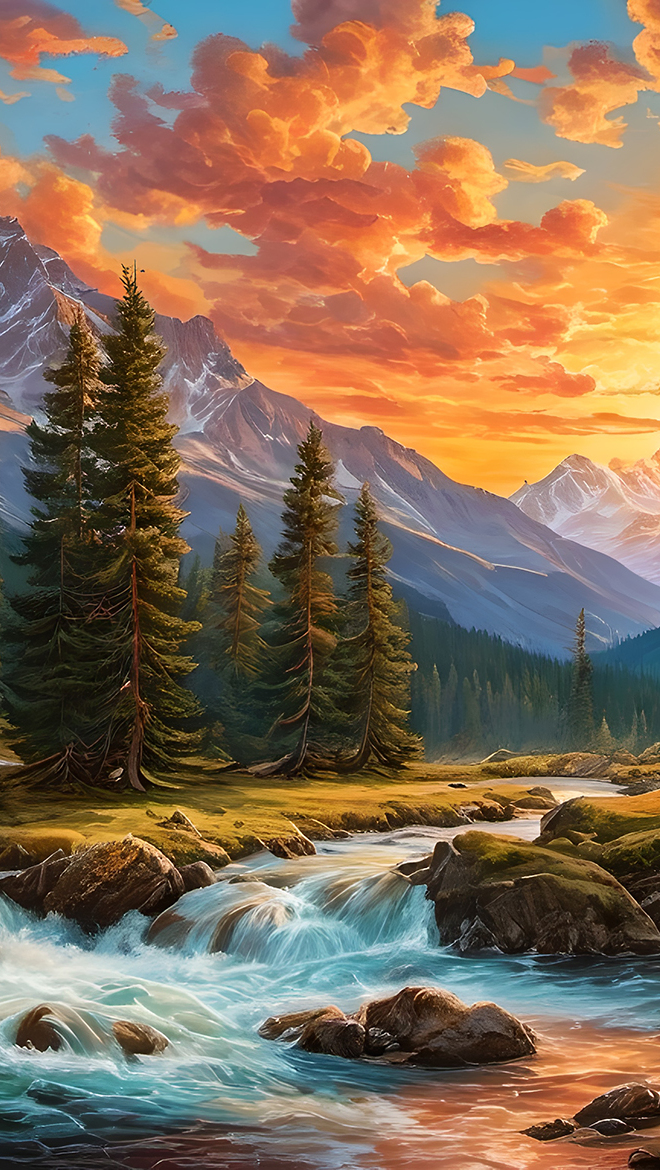 Edytor tapety: Drzewa obok rwącej górskiej rzeki