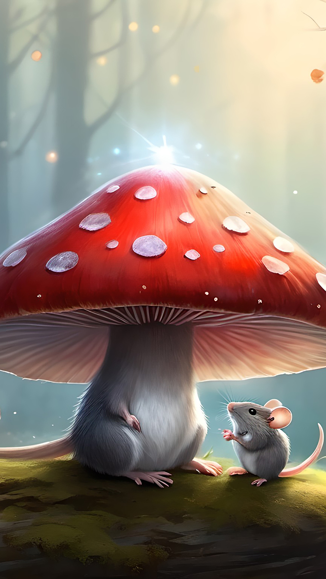 Edytor tapety: Myszka pod kapeluszem muchomora