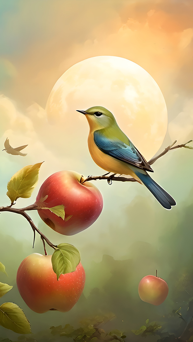 Edytor tapety: Kolorowy ptak i jabłka na gałązce
