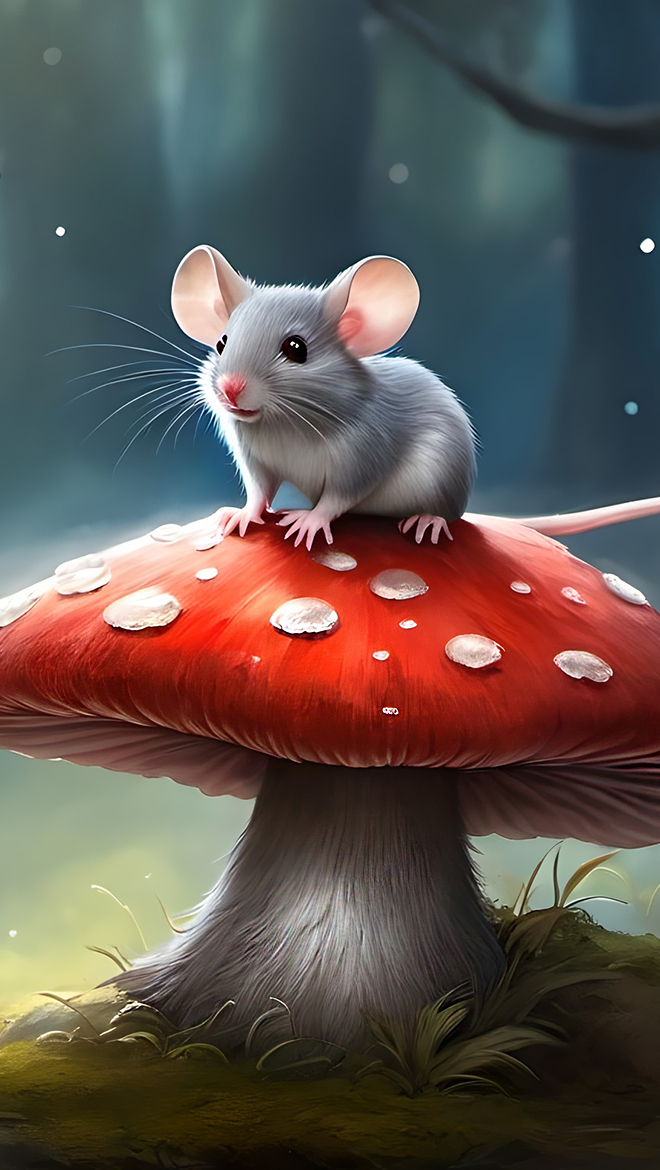 Edytor tapety: Szara myszka na muchomorze