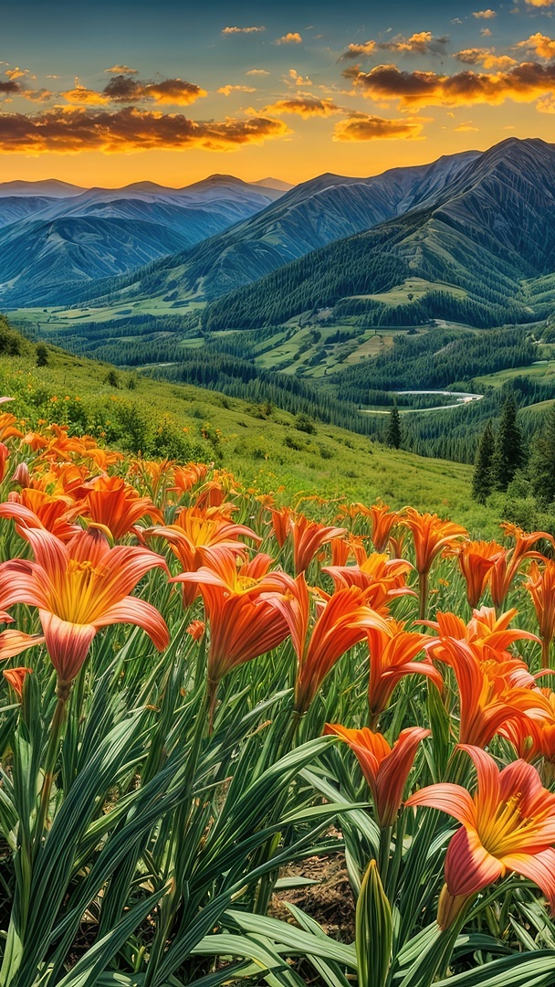 Edytor tapety: Pomarańczowe lilie na zboczu wzgórza