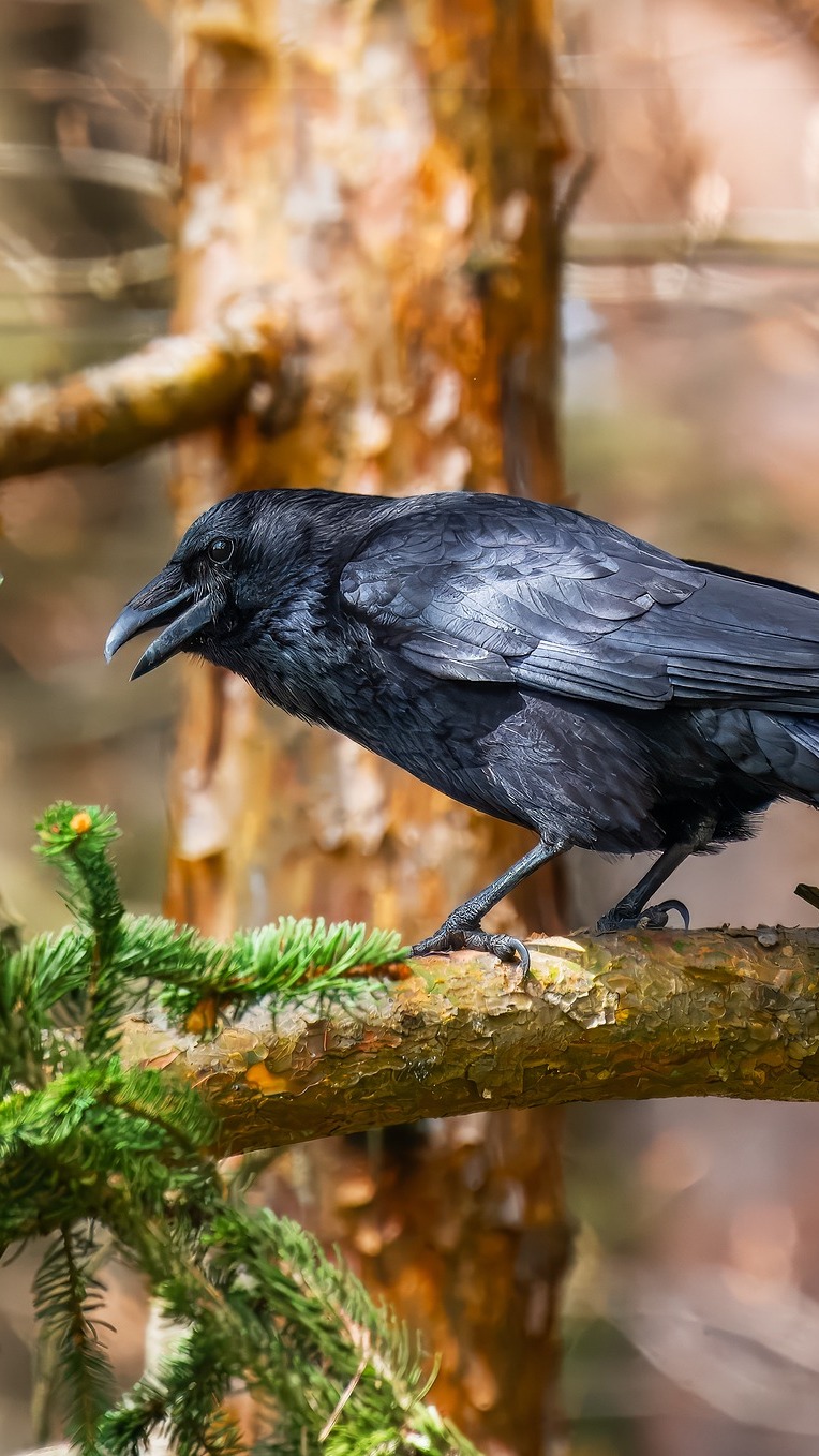 Edytor tapety: Czarny kruk na gałązce drzewa iglastego